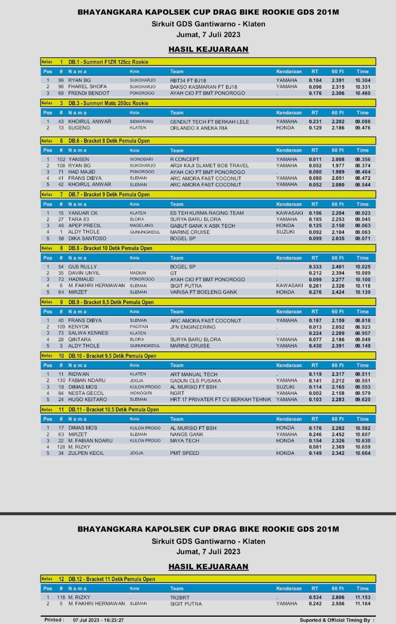 rodaduakita.xyz – Berikut hasil lengkap drag bike GDS yang bertajuk Bhayangkara Kapolsek Cup Dragbike Rookie GDS 201m pada hari Jum’at (7/7).