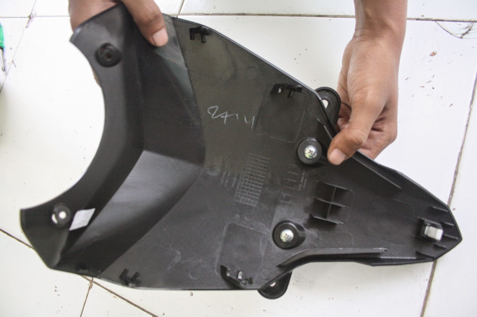 Kover aki tersebut hanya menggunakan dua buah baut pengunci dan flip klip. Jadi untuk melepasnya pertama yang perlu kita lakukan adalah melepas dua buah baut yang ada di bagian atas tepat di bawah batok kepala.