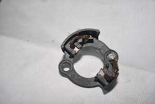 Disini kita bisa lihat keausan pada brush motor starter kita (Gambar 2), menurut buku manual Honda keausan yang diijinkan tidak lebih dari 4 mm, untuk motor-motor yang lain juga tidak jauh berbeda. nah, jika keausan sudah melebihi batas minimum yang diijinkan sudah selayaknya brush kita ganti dengan yang baru.